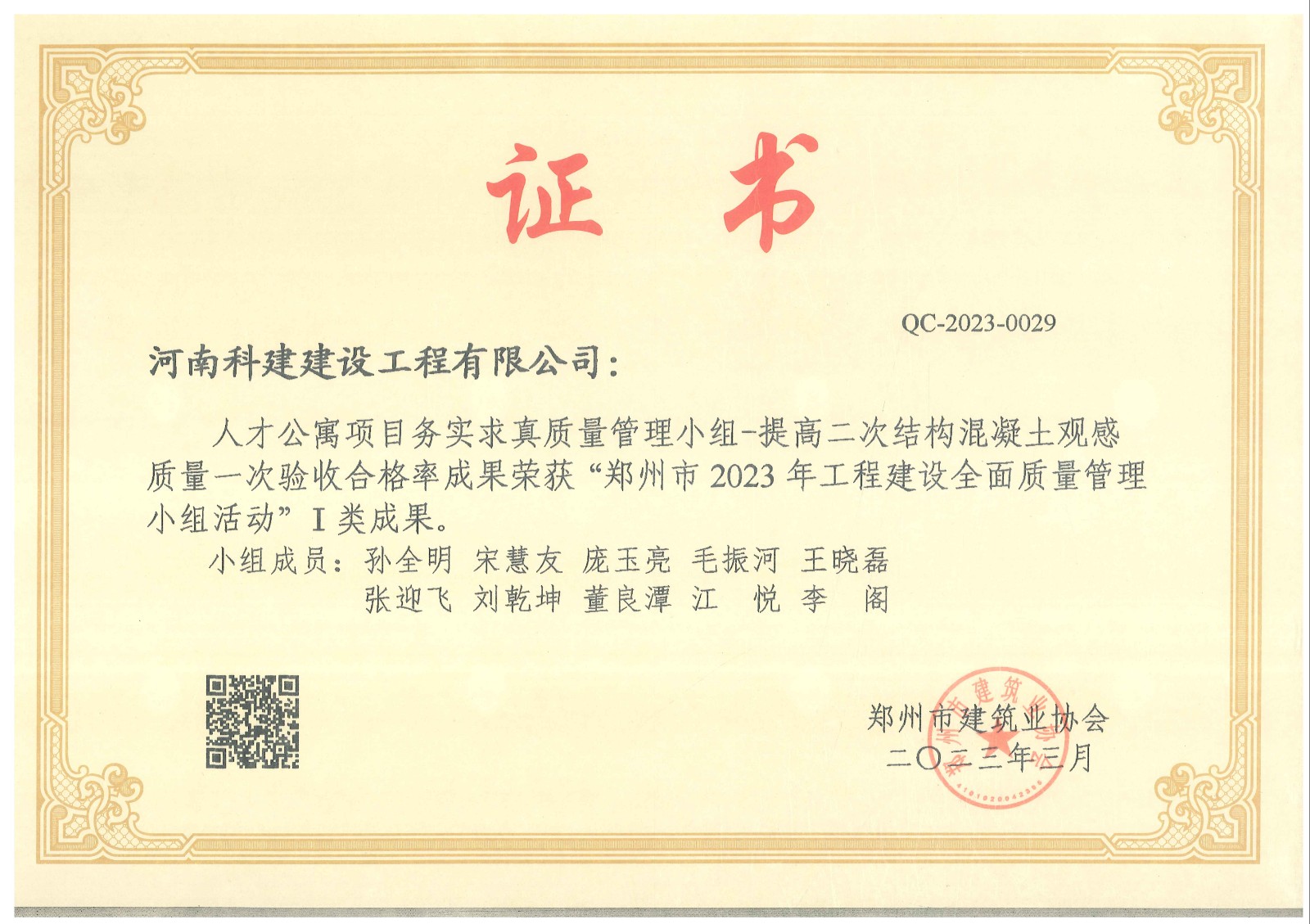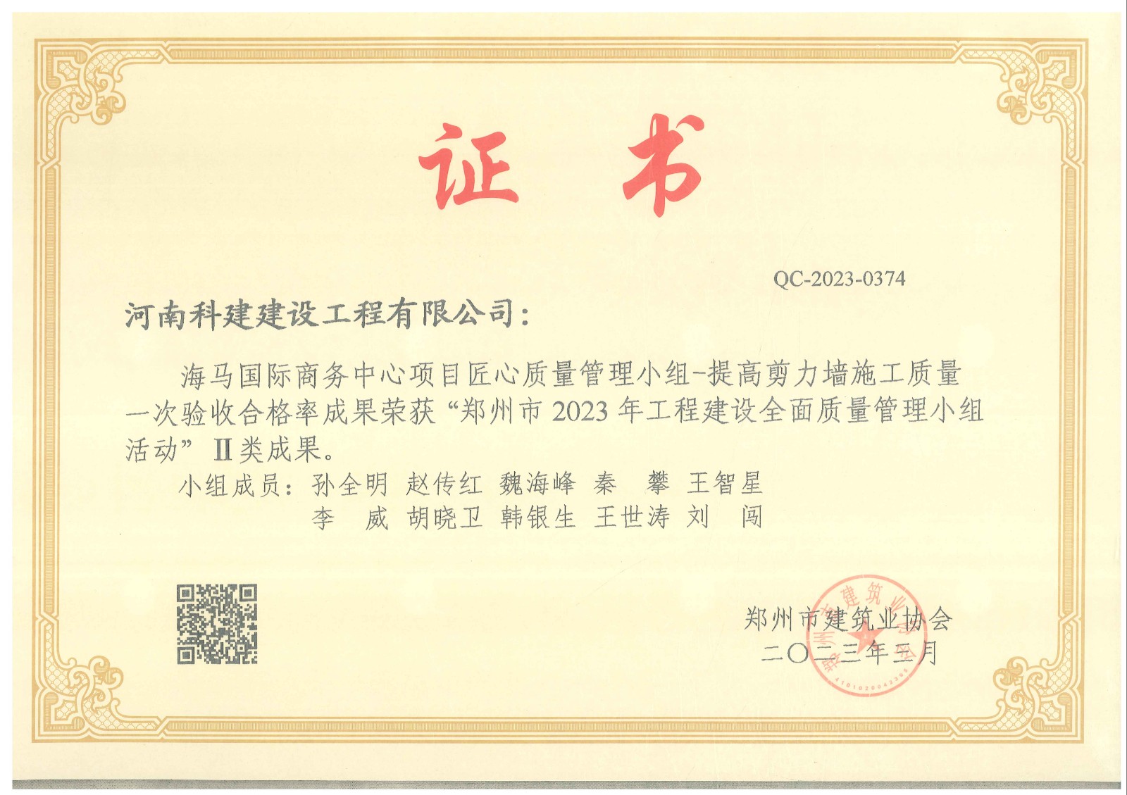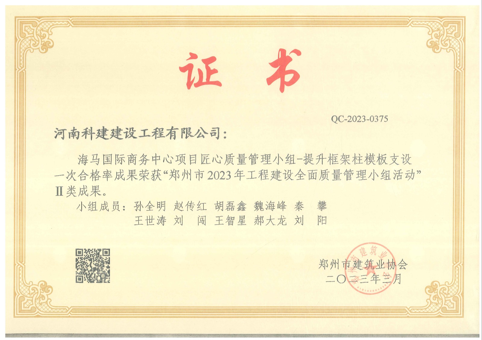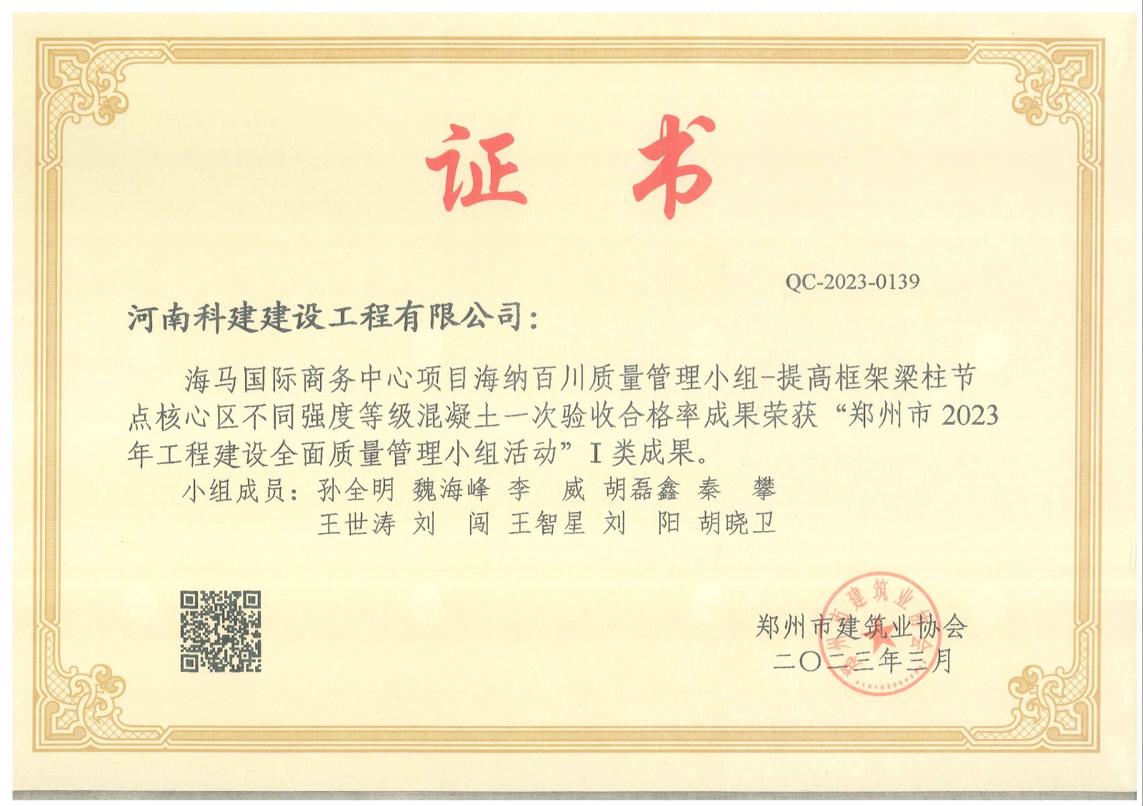 最终我公司海马国际商务中心项目荣获郑州市2023年工程建设全面质量管理优秀QC成果一类成果奖1项,二类成果奖2项。恒大赵村安置区项目荣获一类成果奖1项。经开区人才公寓项目项目荣获一类成果奖1项。